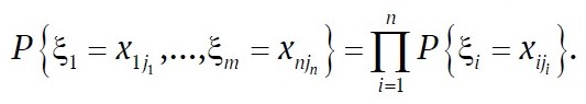 На основании известной теоремы теории вероятностей следует, что независимость алгебр Aξ1, …, Aξn  равносильна независимости порождающих их разбиений αξ1, …, αξn . Это приводит еще к одному эквивалентному определению независимости: случайные величины ξ1, …, ξn независимы, если для любых x1j1, …, xnjn,