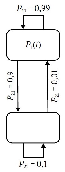 Предположим, что вероятность безотказной работы в заданное время вентилятора ВШЦ-16 (P11) равна 0,9. Вероятность перехода из состояния отказа (P12) составит 0,1. Вероятность восстановления в заданное время (P21) примем 0,99. Вероятность того, что вентилятор не будет восстановлен (P22), соответственно 0,01. С учётом этих данных матрица (2) будет выглядеть следующим образом:
