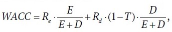 где Re – стоимость собственного капитала; E/(E + D) – доля собственного капитала; Rd – стоимость долгового финансирования; D/(E + D)– доля долгосрочного долга; T – ставка налога на прибыль.