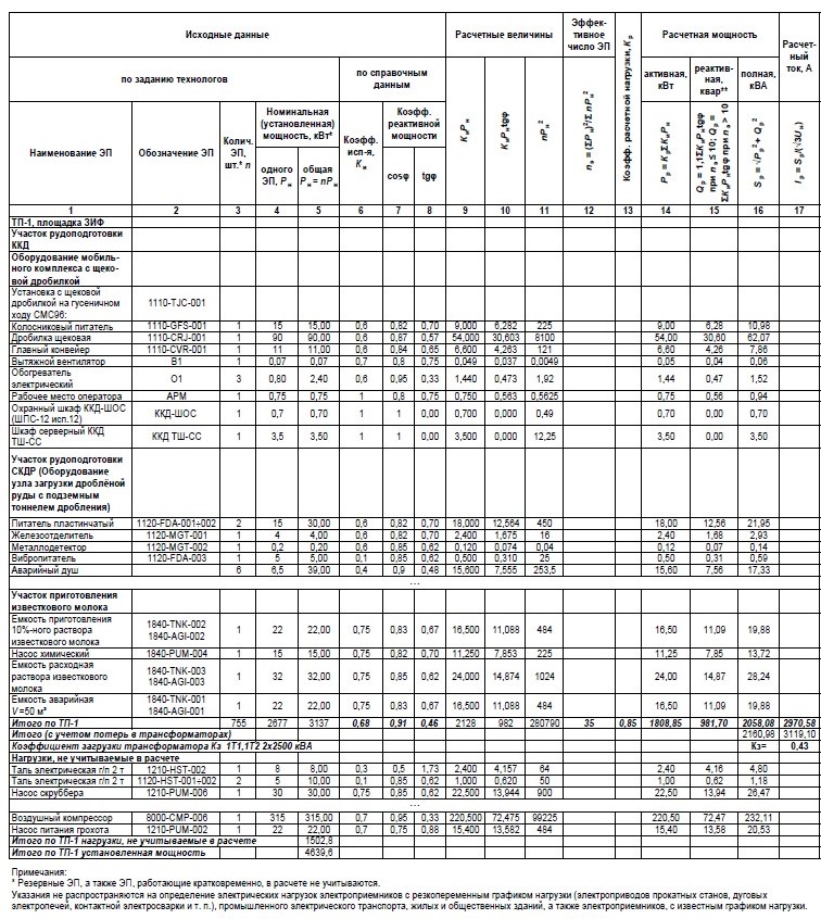Рис. 4. Фрагмент расчета электрических нагрузок ТП-1