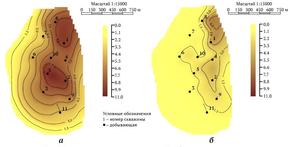 Рис. 4. Карта остаточных подвижных запасов Гильбертского месторождения: а – на начало разработки – 2019 г.; б – на 01.01.2022 г.