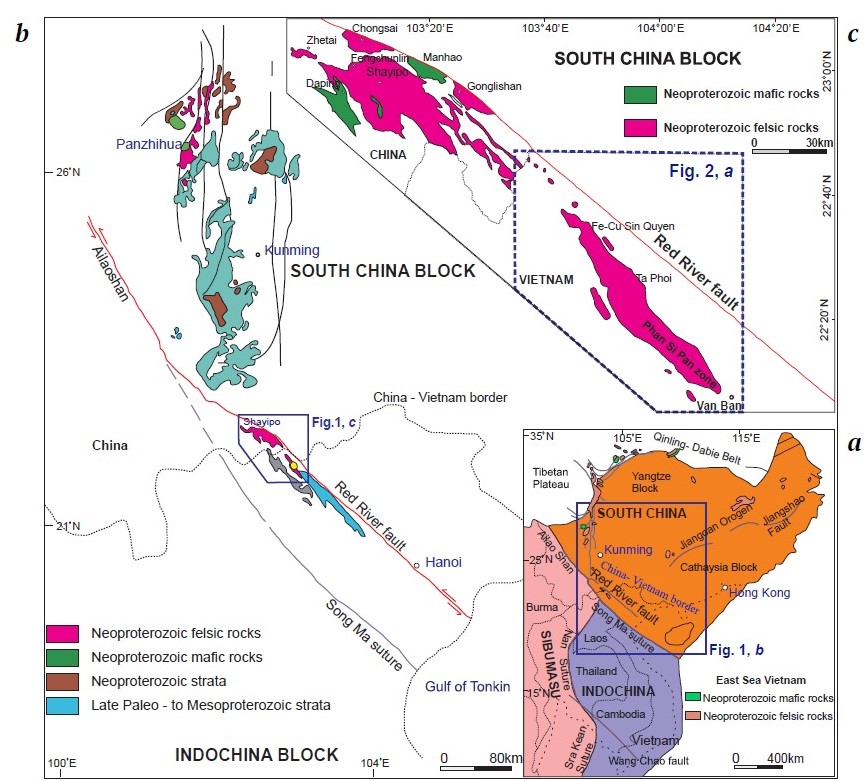 Northwestern Vietnam belongs to the South China and Indochina blocks (Figs. 1, a, b). These blocks are integral components in the palaeogeographic reconstruction of the Rodinia supercontinent [16–19]. Several copper deposits, including the Iron Oxide Copper-Gold (IOCG) deposits of Sin Quyen, and copper Suoi Thau, Ta Phoi, are located in Northwestern Vietnam (Fig. 1, c).
