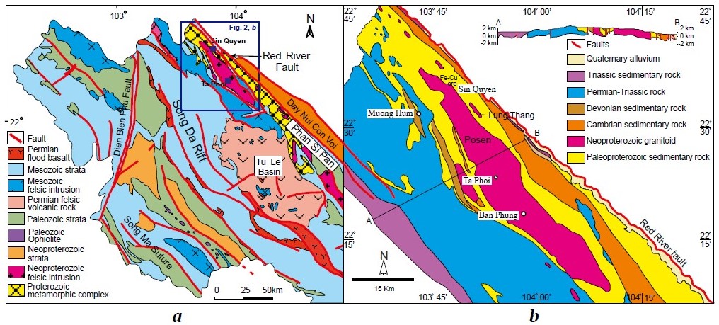 Fig. 2. Geological map of (a) northwestern Vietnam and (b) the Phan Si Pan zone and showing location of the Ta Phoi deposit (modified after [32])
