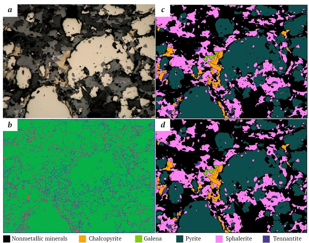 A convolutional neural network model for mineral segmentation and a special method for sampling training data have been developed, allowing the existing class imbalance to be neutralized. The accuracy of mineral segmentation according to the IoU metric was as follows: non-metallic minerals – 0.912, bornite – 0.938, chalcopyrite – 0.899, galena – 0.905, magnetite – 0.650, pentlandite – 0.790, pyrrhotite – 0.928, pyrite – 0.964, sphalerite – 0.922, tennantite – 0.882. The overall pixel accuracy (PA) of the segmentation was 0.96. The differences in mineral identification results can be explained by the difference in the size of the training sets used for LumenStone S1 and LumenStone S2.