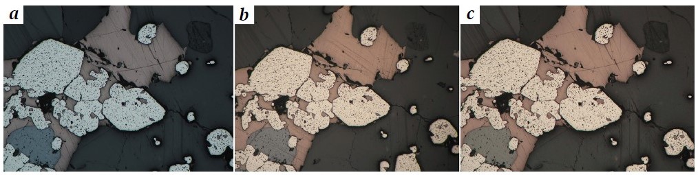 The proposed method allows preserving color differences that are critical for mineral identification (Fig. 2), while minimizing the influence of lighting changes and equipment settings. The algorithm supports two operating modes: an individual correction for each image and a "calibration" mode for a series of images, where the correction matrix is calculated once and applied to the entire group. The method does not require any prior training, and processing a single image takes less than 10 seconds on an Intel Xeon Gold 6226R CPU.
