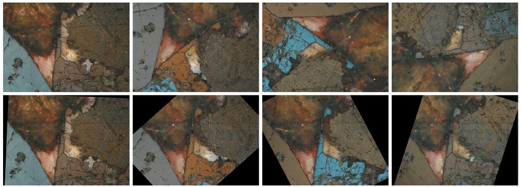 One of the main problems encountered by the authors when working with primary data is high sensitivity of segmentation models to the color palette of images. Differences in color characteristics between training images and real images lead to a significant deterioration in the quality of mineral identification. The color and brightness characteristics of images are determined by many factors: microscope parameters, camera settings, lighting, etc.