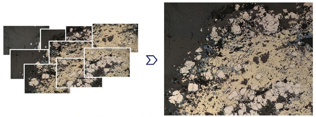 The average polished section area is several square centimeters, with typical ×50 magnification. Under such conditions, only a small part of a polished section, measuring a few square millimeters, is visible in each photograph. The use of photographs covering a large area of a sample would allow more accurate information to be obtained about the distribution of minerals in a sample and their relative positions, which would have a positive effect on the quality of the analysis.