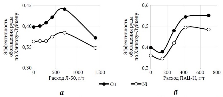 Анализ эффективности обогащения при использовании различных депрессоров в соответствии с критерием Ханкока–Луйкена показал (рис. 2), что максимальное значение ХЛ как по меди, так и по никелю достигается при расходах Л-50 и ПАЦ-Н соответственно 700 и 420 г/т.