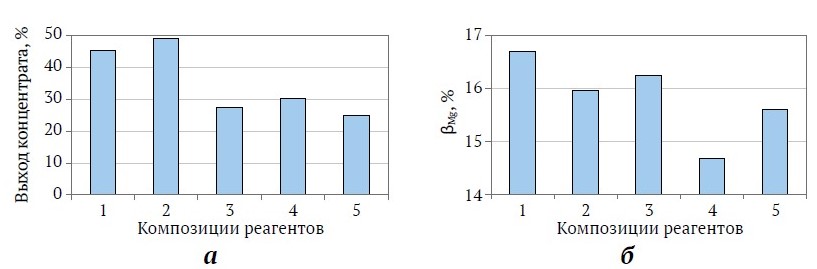 На рис. 3, б видно, что композиция № 4 (MgCl2 и Л-50) обеспечивает наименьшее содержание магния в концентрате: 14,7 против 16,7 % для № 1 (без депрессоров) и 15,6 % для № 5 (MgCl2 и ПАЦ-Н). В целом содержание магния в концентрате снижается примерно на 2 %.