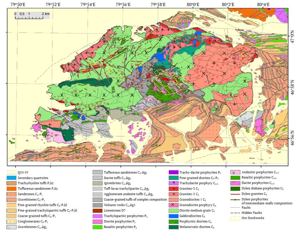 The Aktogai deposit is located in the eastern part of the Central Aktogai Massif. This pluton, a porphyritic granodiorite body, intruded through the diorite, quartz diorite, and granodiorite of the Koldar pluton. The porphyritic granodiorite is cut by an elongated stock consisting of ore-bearing granodiorite and plagiogranite (tonalite) porphyries, accompanied by a series of chimney bodies of explosive breccias with quartz-biotite and sericite-tourmaline matrices, formed together with the porphyry intrusion. The magmatic complex's vein rocks represented by diorite and diabase porphyrites, quartz and dacite porphyries are not widespread. A special group is represented by small bodies and dykes of fine-grained matrix granodiorite-porphyry and glassy matrix granodiorite-porphyry, as well as large dyke-like granite bodies in the Aidarly area [25, 26].
