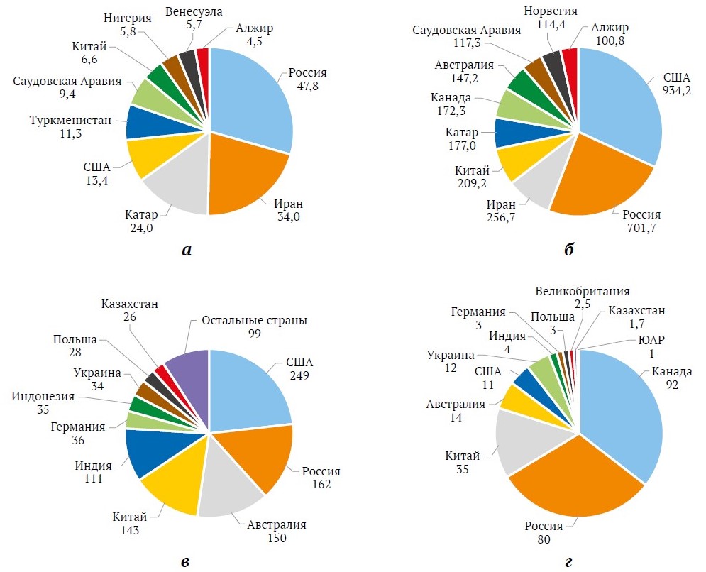 На рис. 1 показаны мировые запасы (а) и объемы добычи (б) природного газа на начало 2023 г., по данным ОПЕК они оценивались в 207,9 трлн м3. В то же время мировые запасы нефти по данным Федерального агентства энергетической информации США (Energy Information Administration) по состоянию на 2023 г. составляли 1,7 трлн баррелей. Однако восполнить потребности энергоресурсов возможно за счет добычи газа метана из нетрадиционных источников, запасы которых значительно превышают запасы традиционных месторождений. Мировые объемы добычи угля на 2033 г. по данным Международного энергетического агентства составят 8,7 млрд т, при запасах каменного – 9,5 трлн т и бурого – 4,9 трлн т. Наличие существенных запасов свидетельствует о содержании большого объема метана в недрах, значит, и проекты по его оценке и последующей добыче могут оказаться перспективными (рис. 1, в, г). При этом согласно данным Международного энергетического агентства по состоянию на 2023 г. мировая добыча метана из угольных пластов может достичь уже 200 млрд м3 к 2035 г. Из статистических отчетов1 также следует, что общемировые прогнозные ресурсы газа из нетрадиционных источников превышают в 2,2 раза его наличие в традиционных месторождениях, при этом лидирующие позиции по ресурсам занимают Канада, Россия и США, а по добыче – США2.