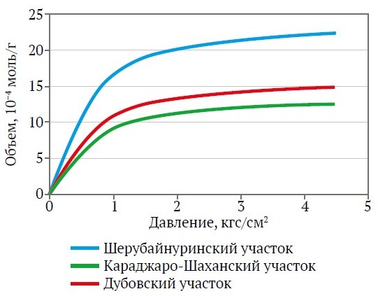 Для анализа сорбционной ёмкости углей использованы изотермы Ленгмюра, традиционно применяемые в исследованиях CBM-месторождений5. Вклад авторов заключается в уточнении коэффициентов уравнения Ленгмюра угольных пластов Карагандинского бассейна на основе лабораторных данных с учётом температурных условий и петрографического состава (в частности, содержания фюзинита и витринита). Предложенный подход впервые интегрирует параметры десорбции, проницаемости, влажности, метаморфизма и петрографии в единую балльную систему для комплексной оценки перспективности участков, что является развитием подходов, ранее описанных в работах [8, 9].